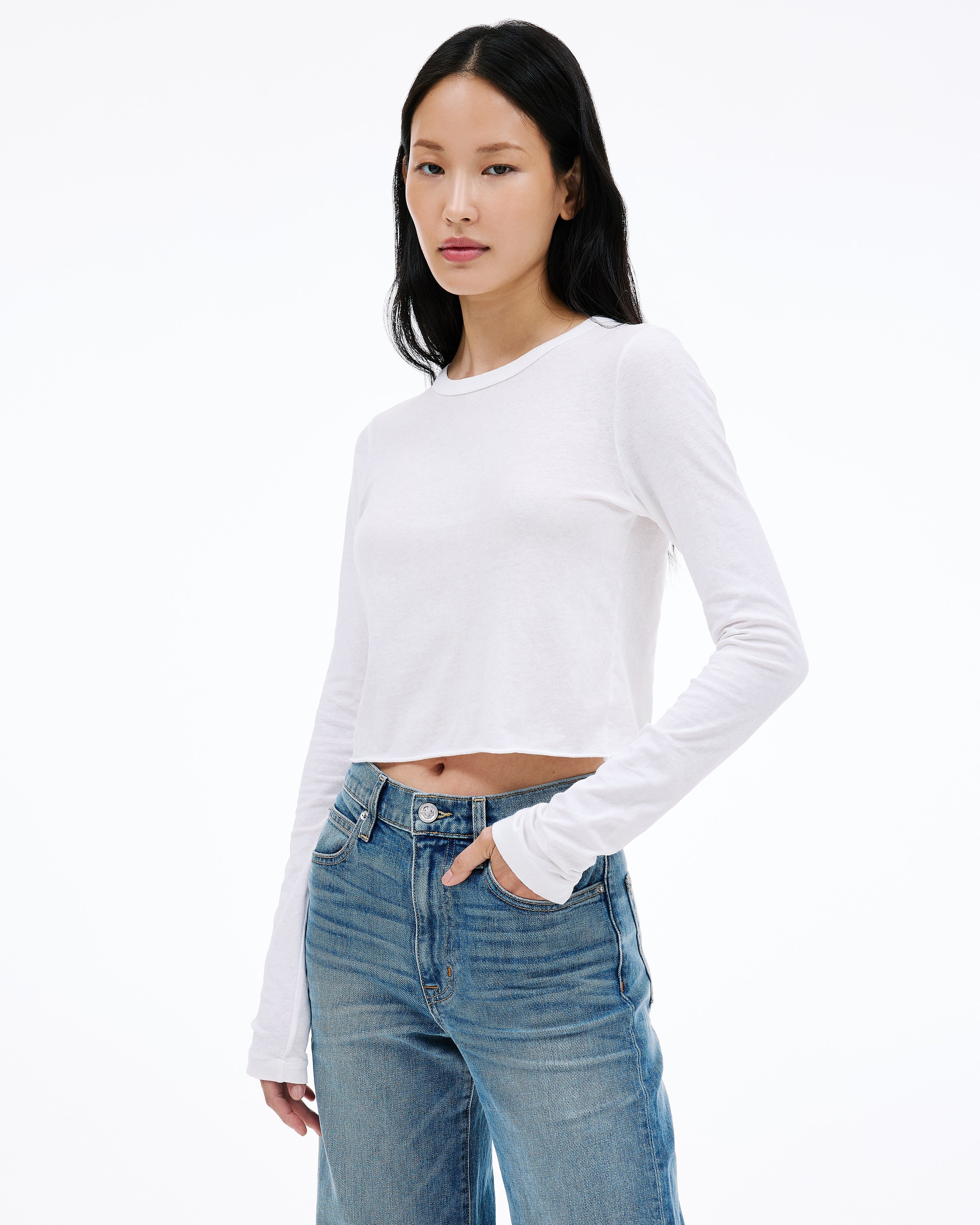 Baby Long Sleeve crafted from a unique light weight open-end fabric for an authentic vintage look and feel. Designed with a cropped length and hand finished with a raw hem detail.