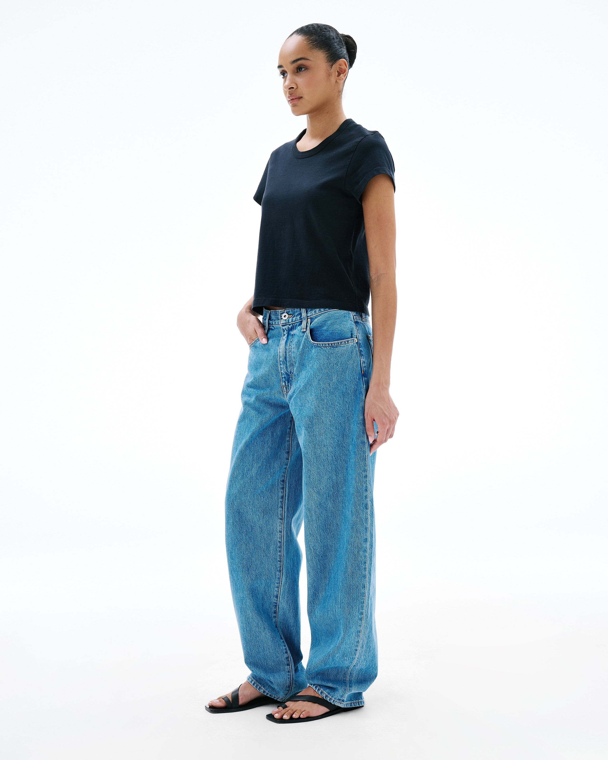 Ella features a relaxed body and curved leg with a mid-rise waist, offering an effortless yet refined fit.