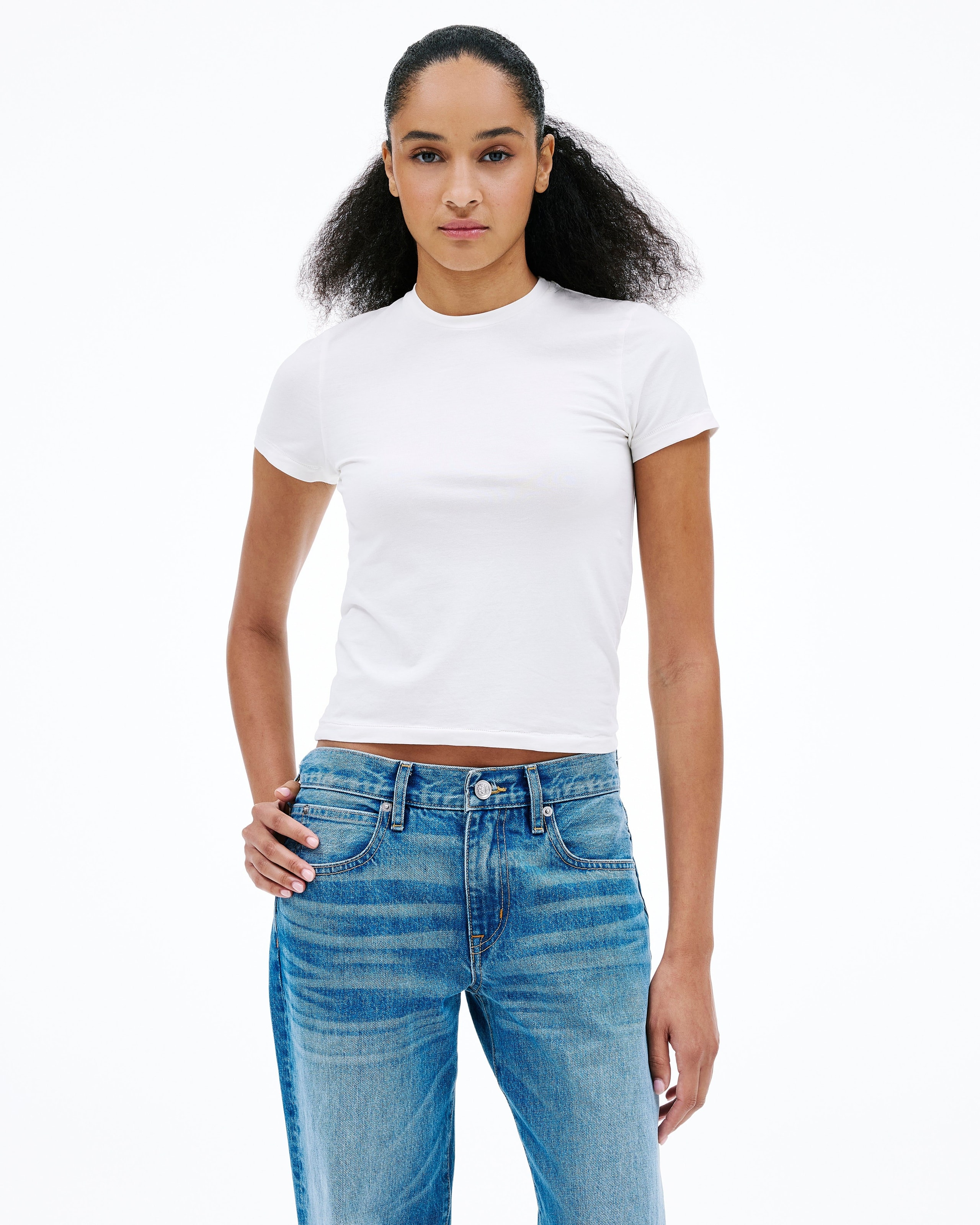 Crafted from premium Supima stretch fabric in a midweight knit, this style offers a soft hand feel and effortless comfort. Designed with a modern silhouette and subtle cap sleeve for an elevated everyday look.
