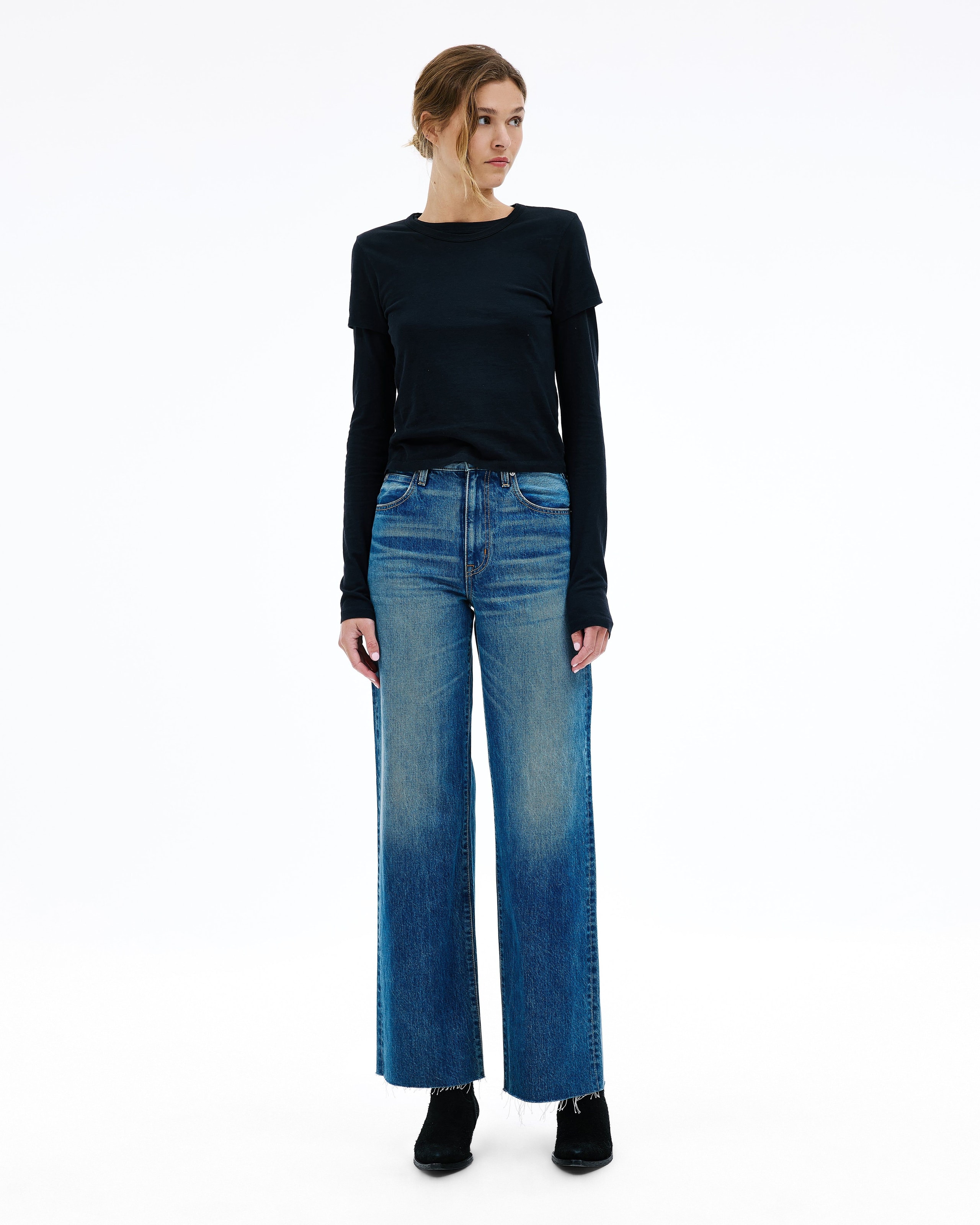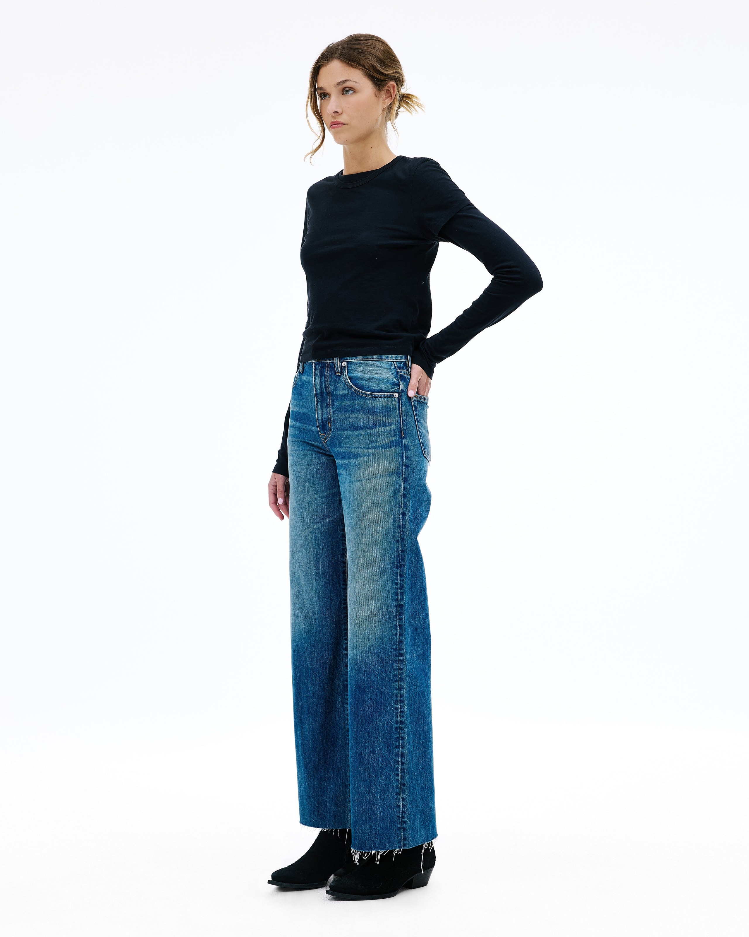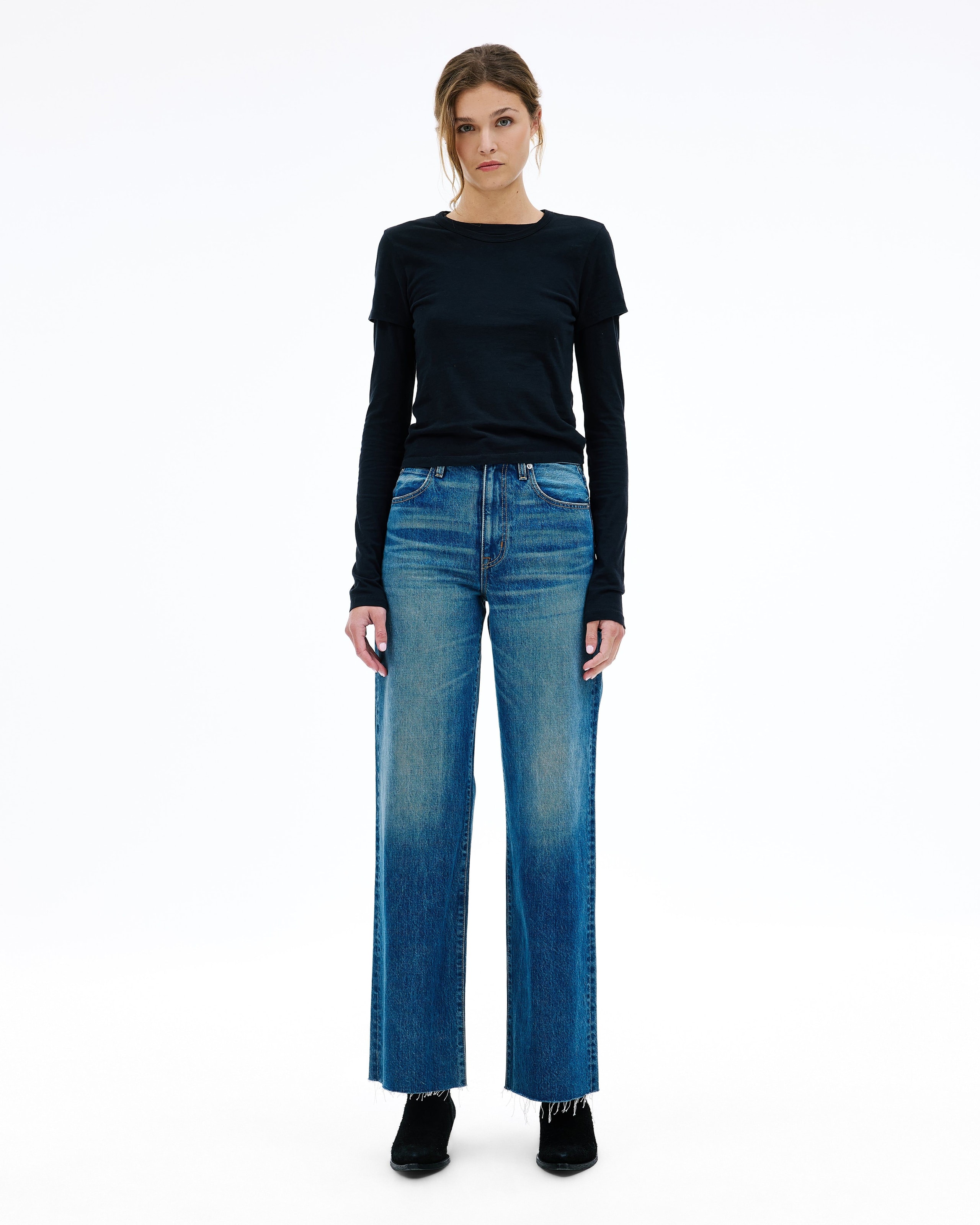 Grace is a SLVRLAKE signature style designed to elongate the leg. Featuring a high-rise waist and wide-leg silhouette, it fits close through the waist and hip before flowing through the leg, finished with a raw hem. An essential style offering versatile styling options.