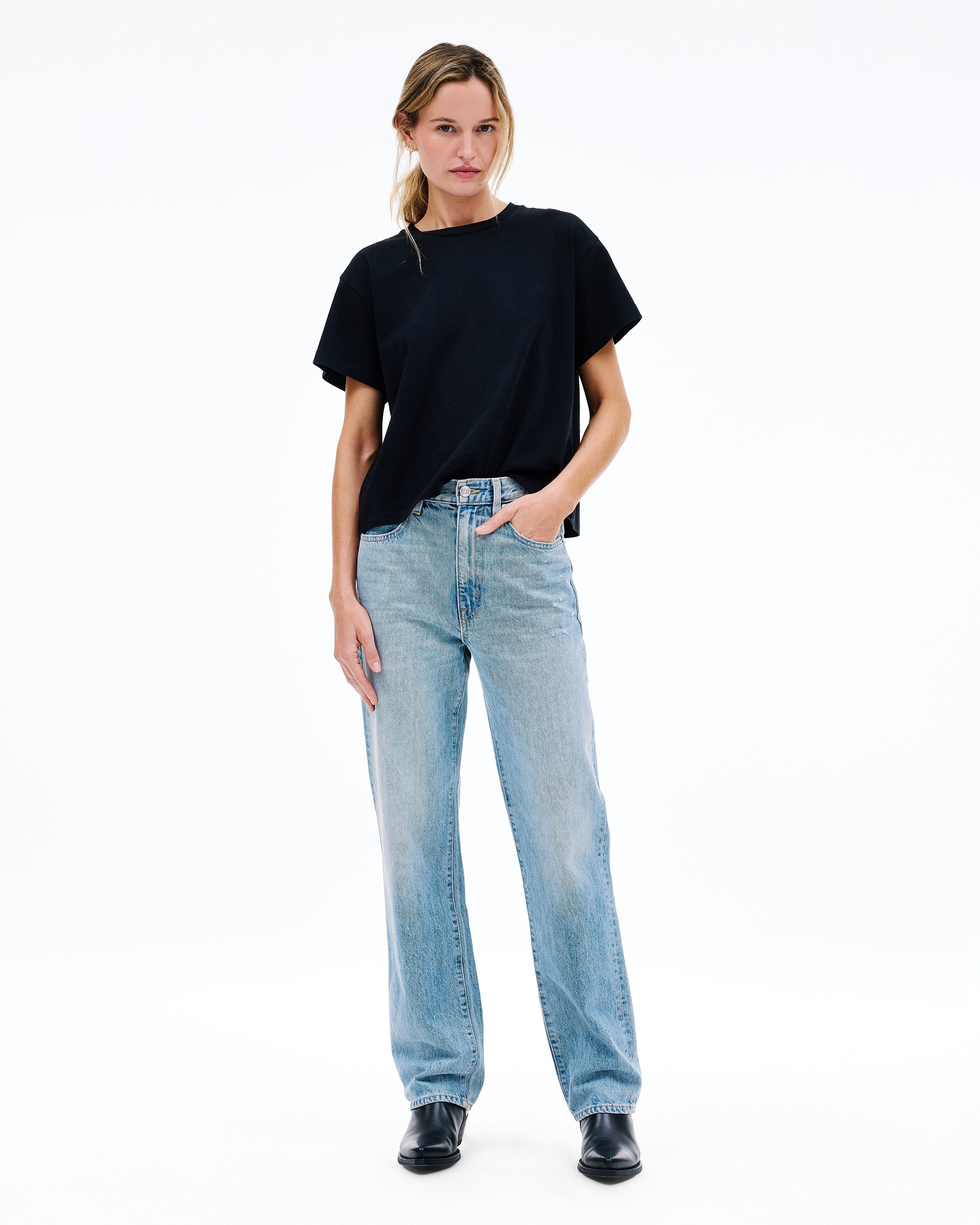 This signature style is designed to fit and flatter the feminine form, visually elongating the leg with a straight leg silhouette and high rise.