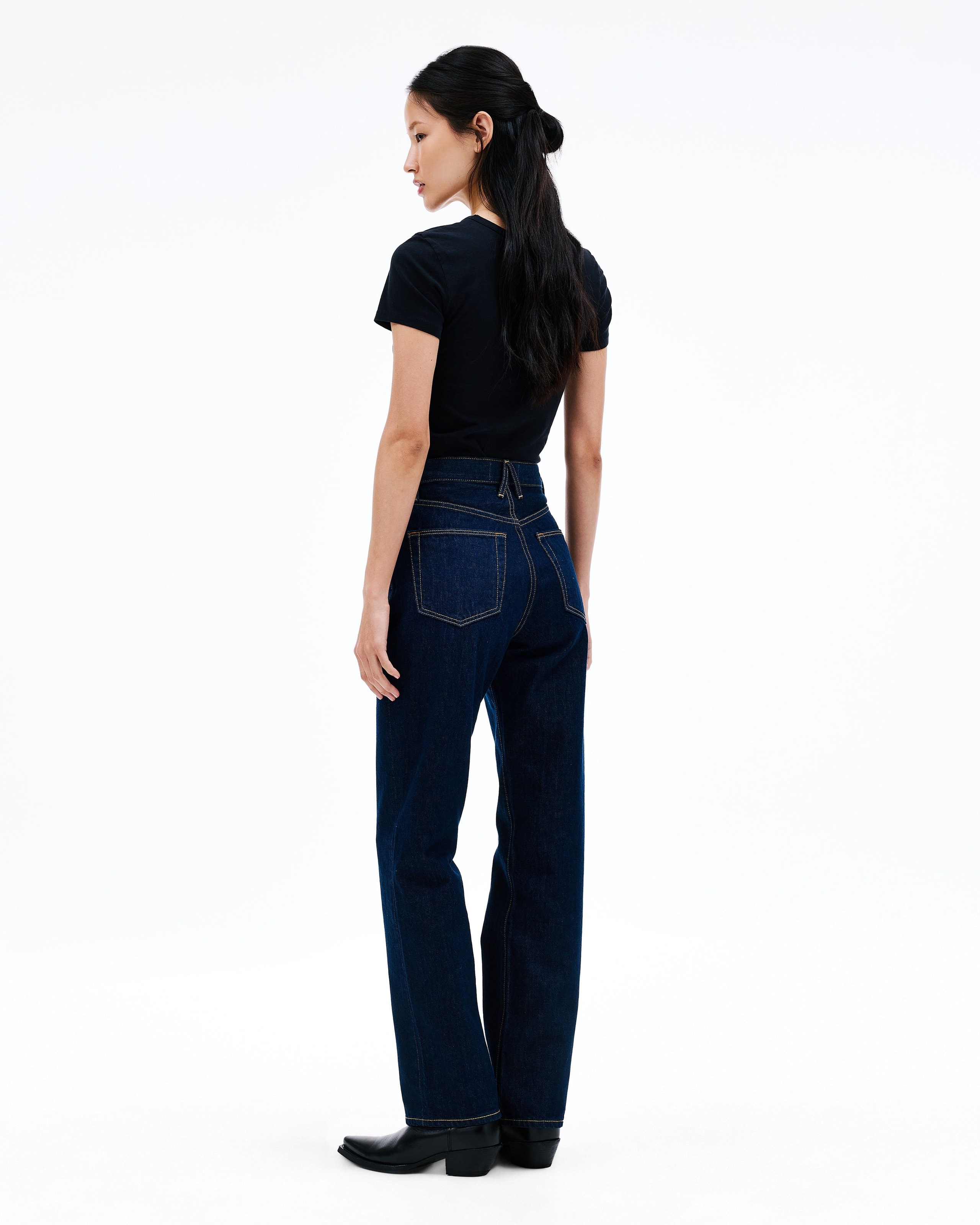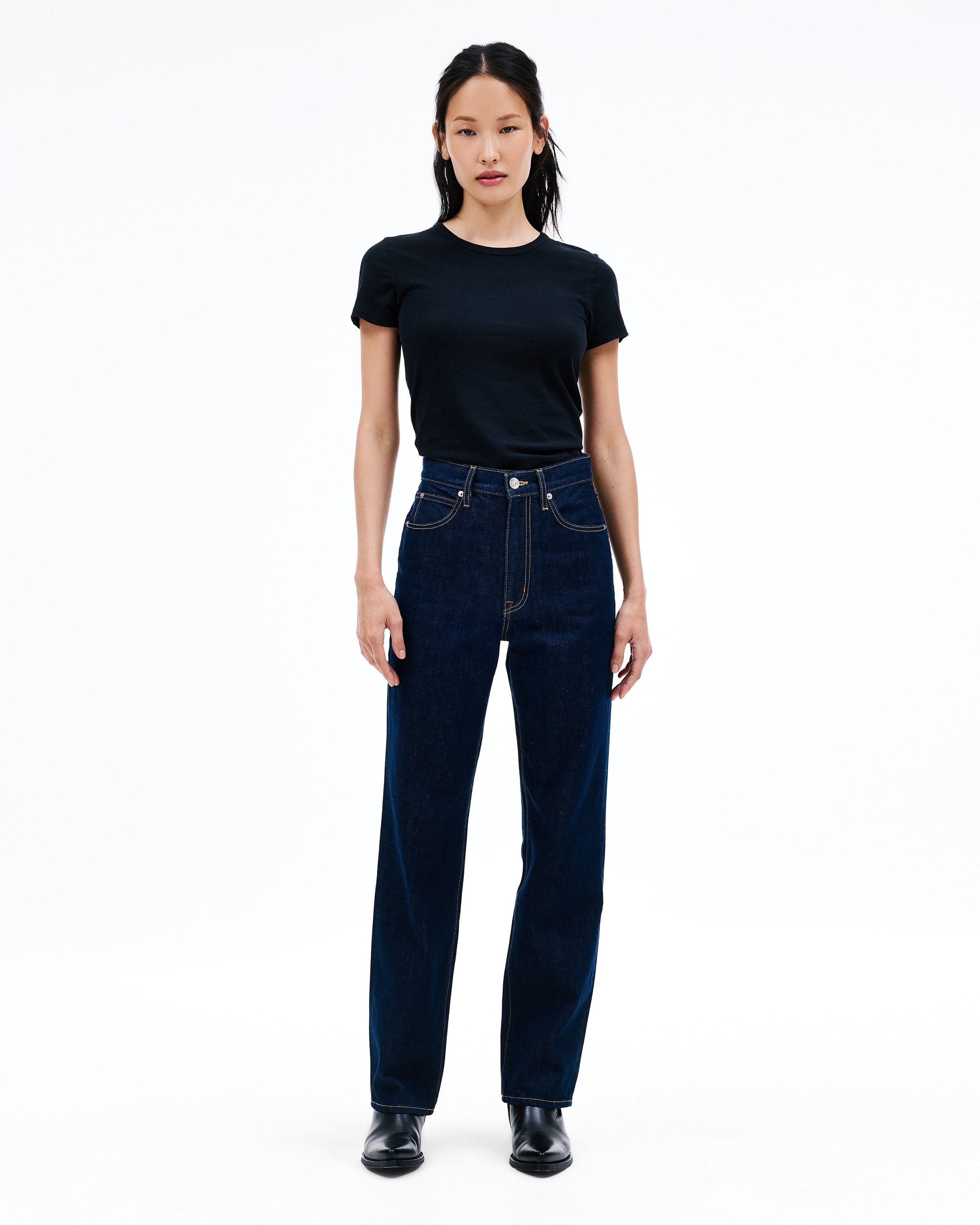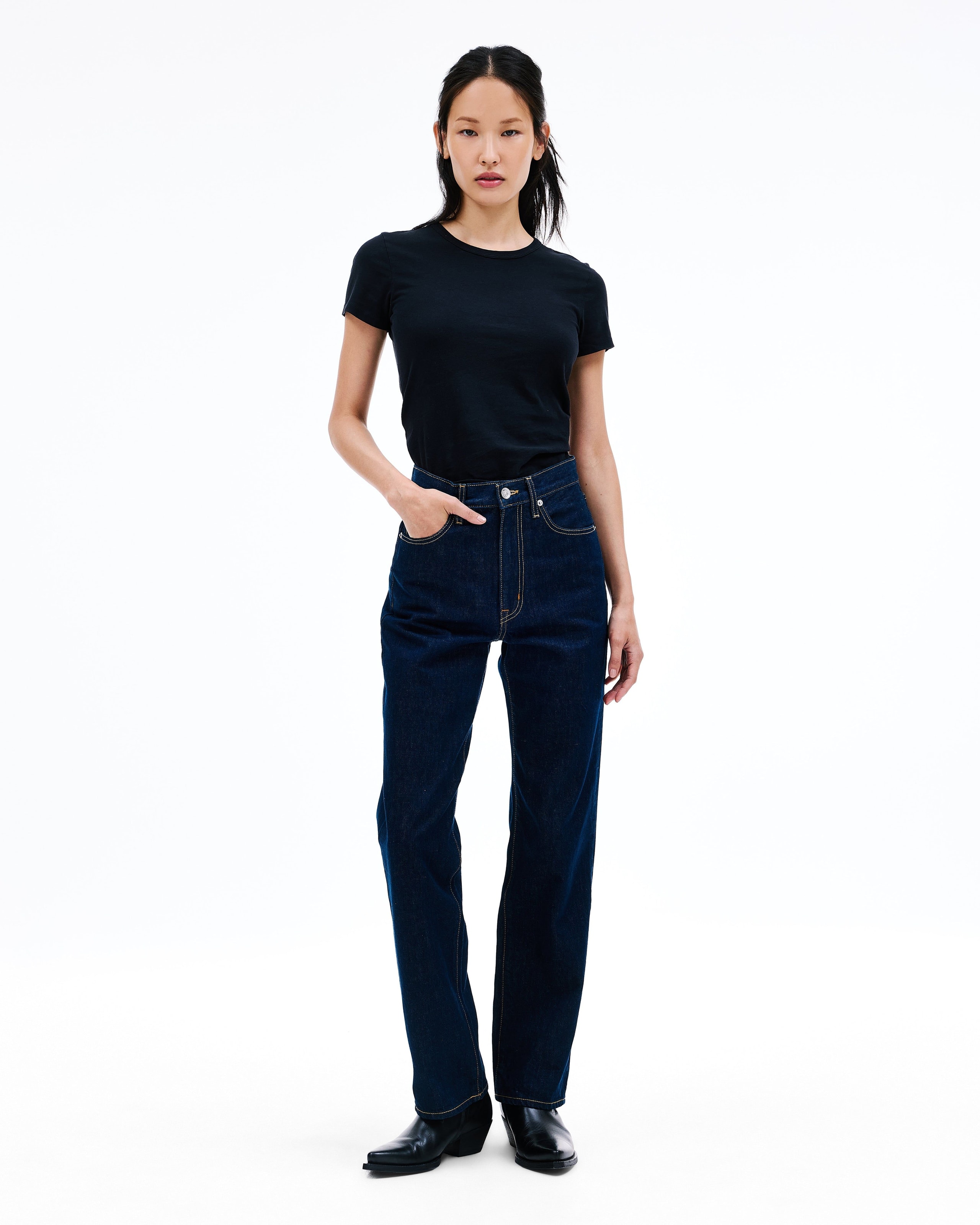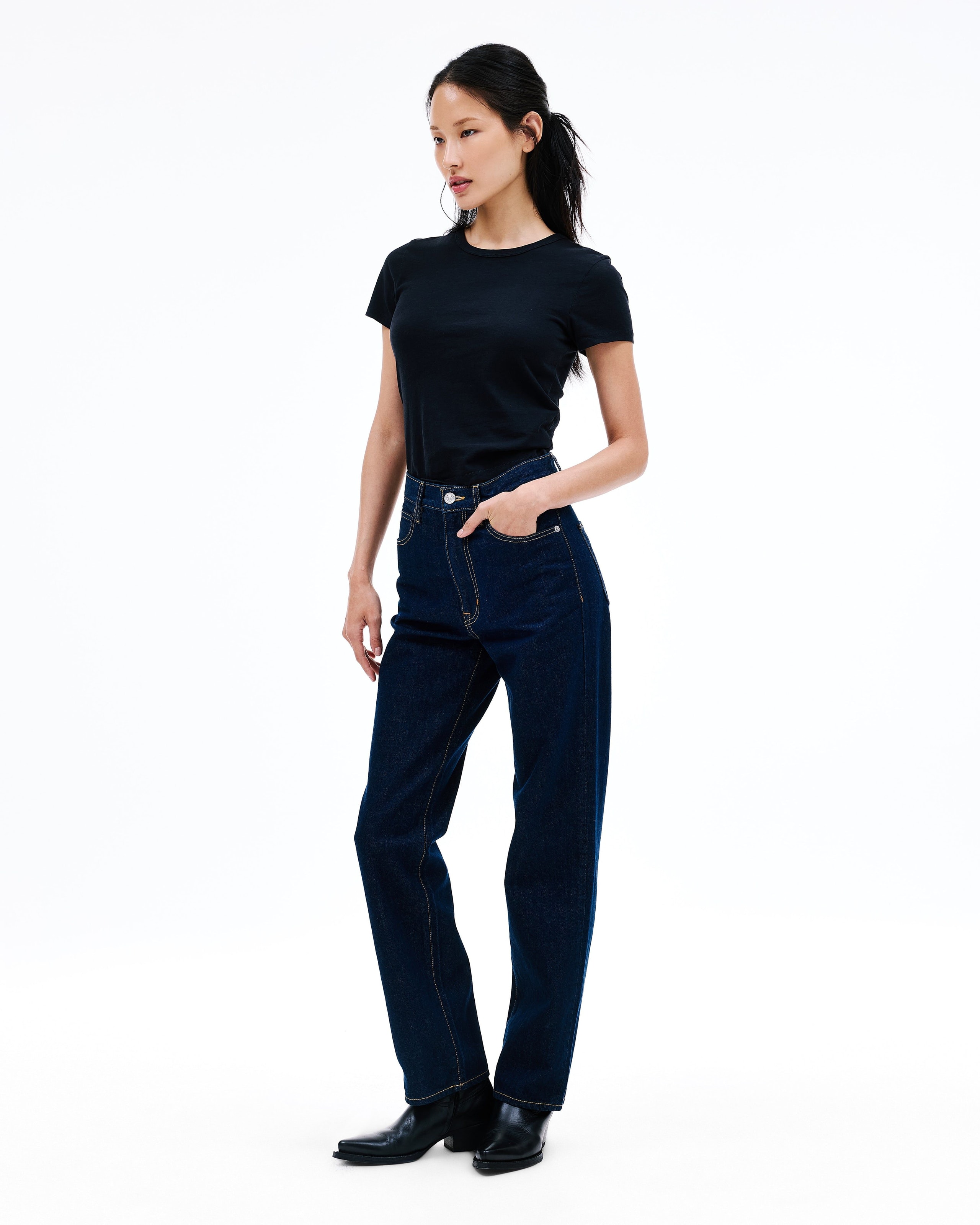 This signature style is designed to fit and flatter the feminine form, visually elongating the leg with a straight leg silhouette and high rise.