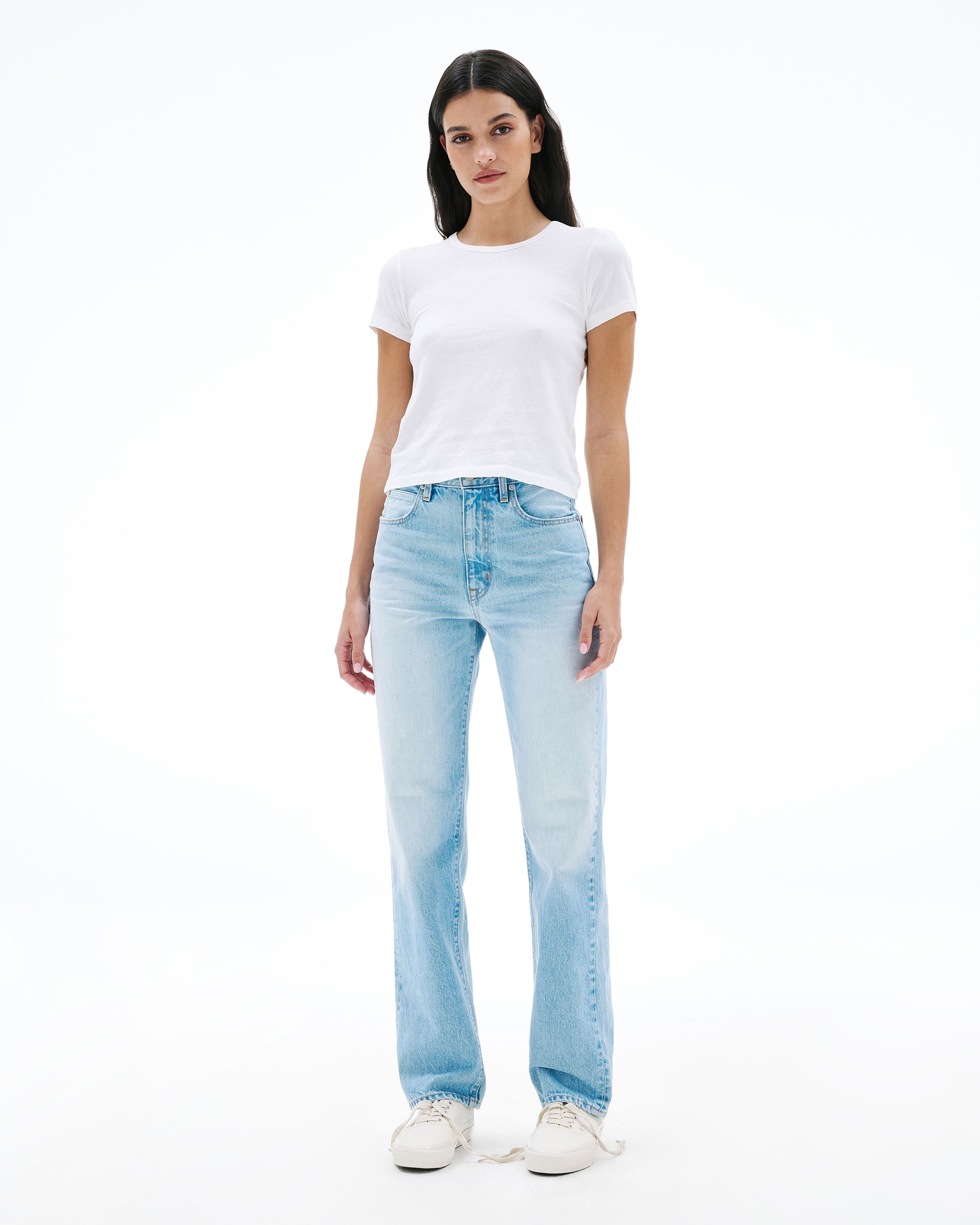 This signature style is designed to fit and flatter the feminine form, visually elongating the leg with a straight leg silhouette and high rise.