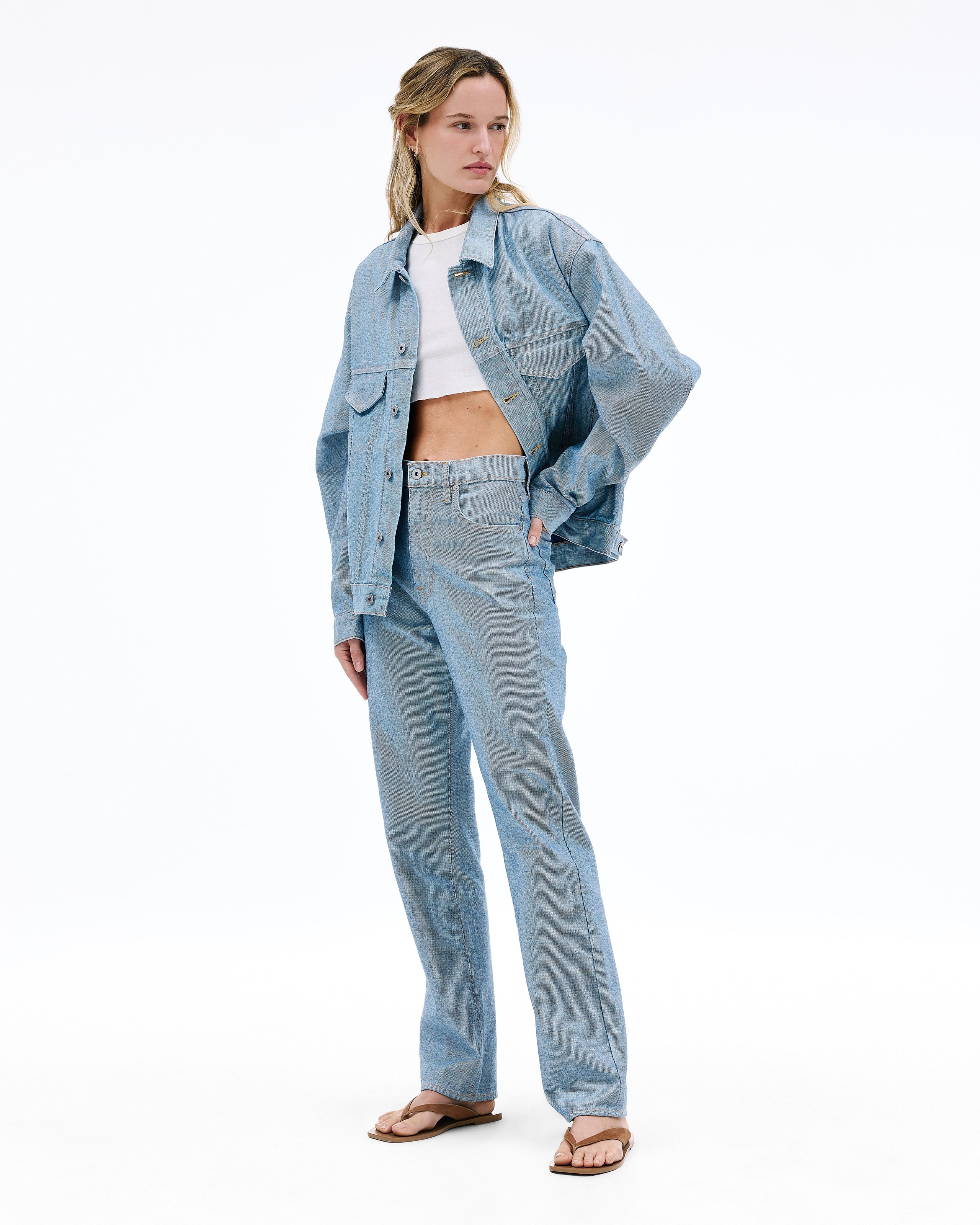 Sky Reverse is crafted from recycled cotton and showcases the reverse side of denim for a distinct finish, complemented by white hardware for a clean, modern look.